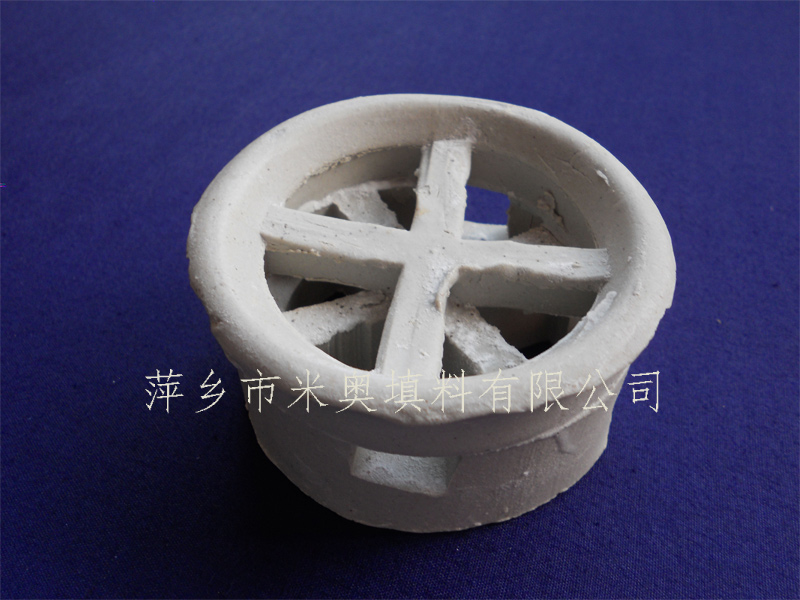 由于陶瓷阶梯环的侧端增加了翻边,不但可以增加填料环的机械强度,而且由于破坏了填料结构的对称性,因而增加了填料投放时的定向几率。又由于翻边的影响,使得填料在堆积时填料环隙之间的接触由此线性接触为主变为以点接触为主。这样,不但增加了填料颗粒之间的空隙,减少了气体穿过填料层的阻力,而且这些接触点还可以为液体沿填料表面流动的汇聚分散点,从而促进了液膜的表面更新,有利于填料传质效率的提高。因此,陶瓷阶梯环的性能较鲍尔环又有了进一步的提高。